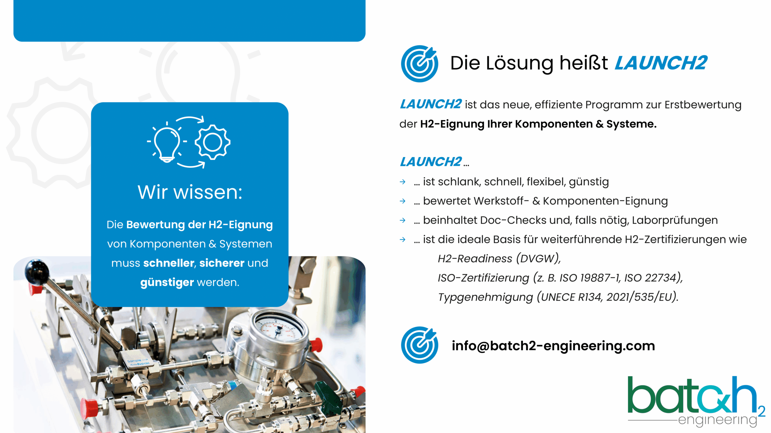 An dieser Stelle setzt der neue LAUNCH2-Standard für Wasserstoff-Kompatibilität und -Sicherheit an. Der Standard versteht sich nicht als Konkurrenz zu bestehenden Normen und Richtlinien, sondern als risikobasierter und pragmatischer Bewertungsrahmen, der eine erste, kosteneffiziente Orientierung zur Wasserstoff-Eignung von Produkten und Systemen gibt, aber gleichzeitig auch sehr solide technische Nachweise liefert.